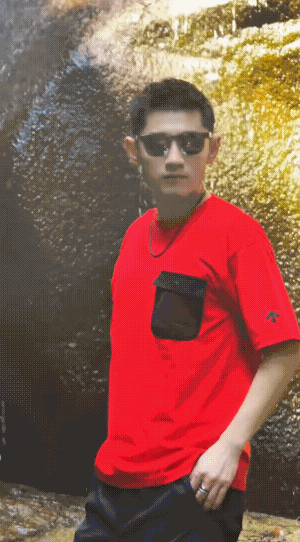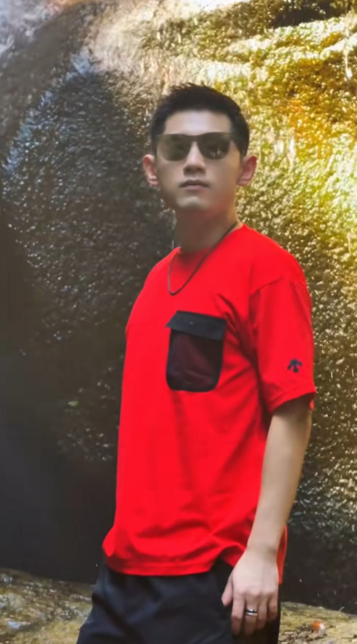 现场有不少人,有人穿着古装,有人撑伞,张继科穿着红色T恤,黑色短裤,干净利落。